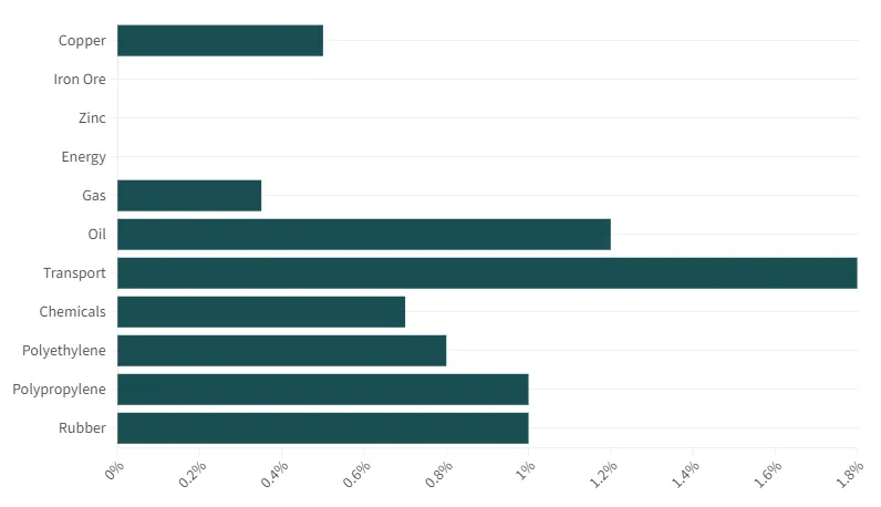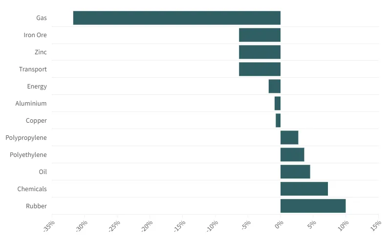 Im Gegensatz dazu erreichten die Ölpreise ein Viermonatshoch. Die Preise für Chemikalien stiegen auf breiter Front und Kautschuk erreichte den höchsten Stand seit 21 Monaten.