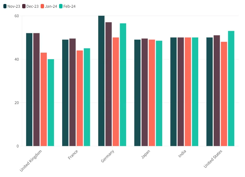 fiel von 51,3 im Dezember 2023 und 43,1 im Januar 2024 auf 40,6 im Februar 2024. Eine kürzlich durchgeführte Branchenumfrage ergab, dass 55 % der britischen Exporteure von Störungen durch das Rote Meer betroffen waren.