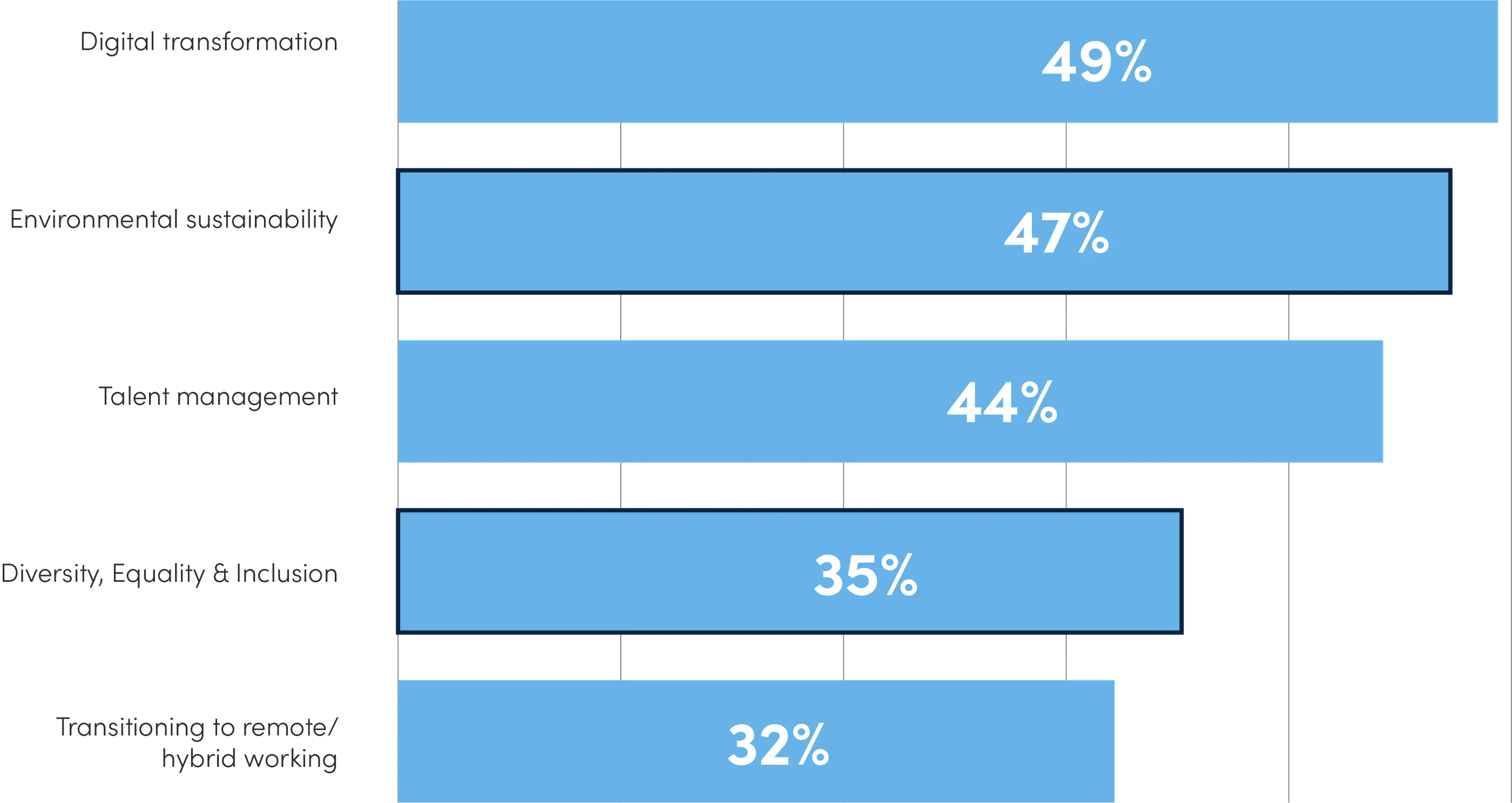 Our research shows that almost half (49%) of corporates are investing in digital transformation programmes. Companies see adopting more agile IT infrastructure that builds enterprise-wide resilience geared to meet any future periods of uncertainty as a key success factor. Talent management remains as critical as ever.