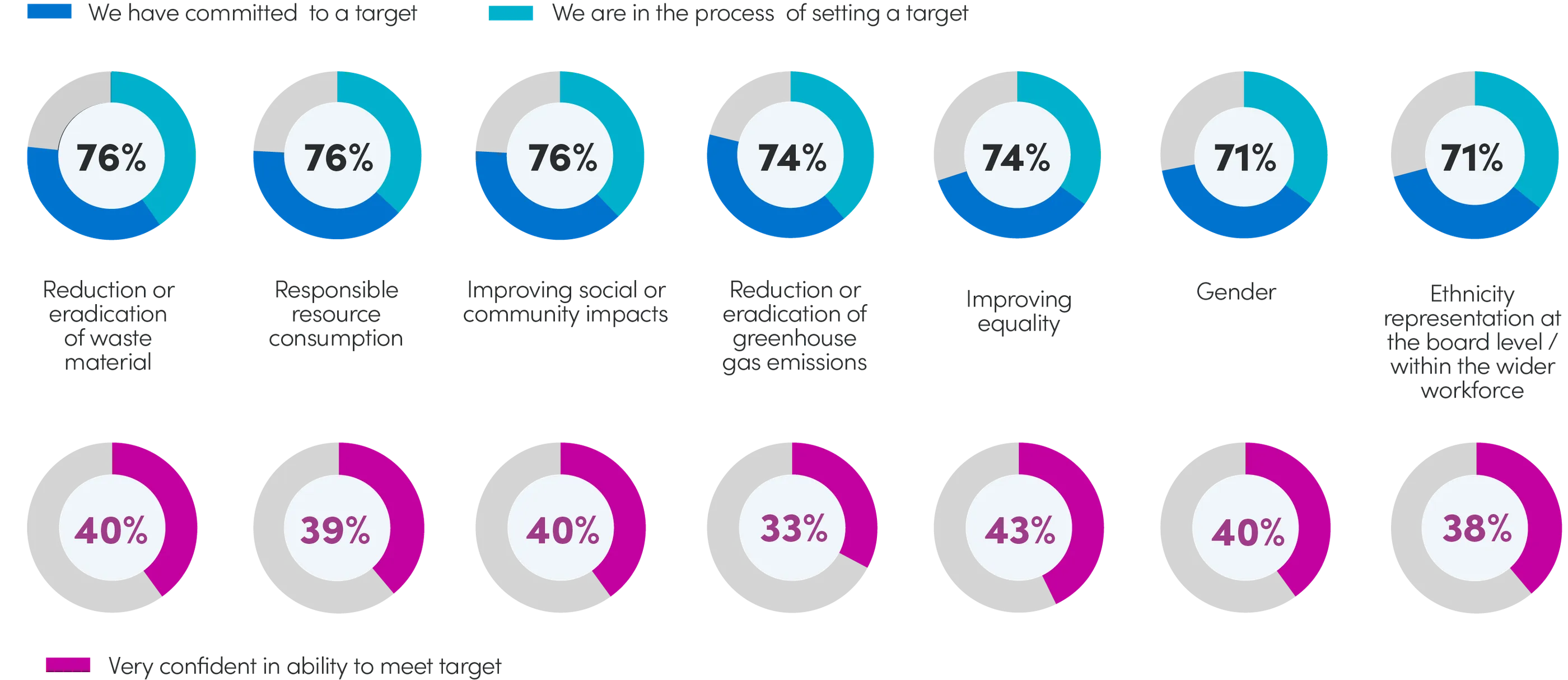 More than three quarters of businesses have set – or are in the process of setting – a target to reduce or eradicate waste material (76%), adapt to responsible resource consumption (76%), and improve social or community impacts (76%).