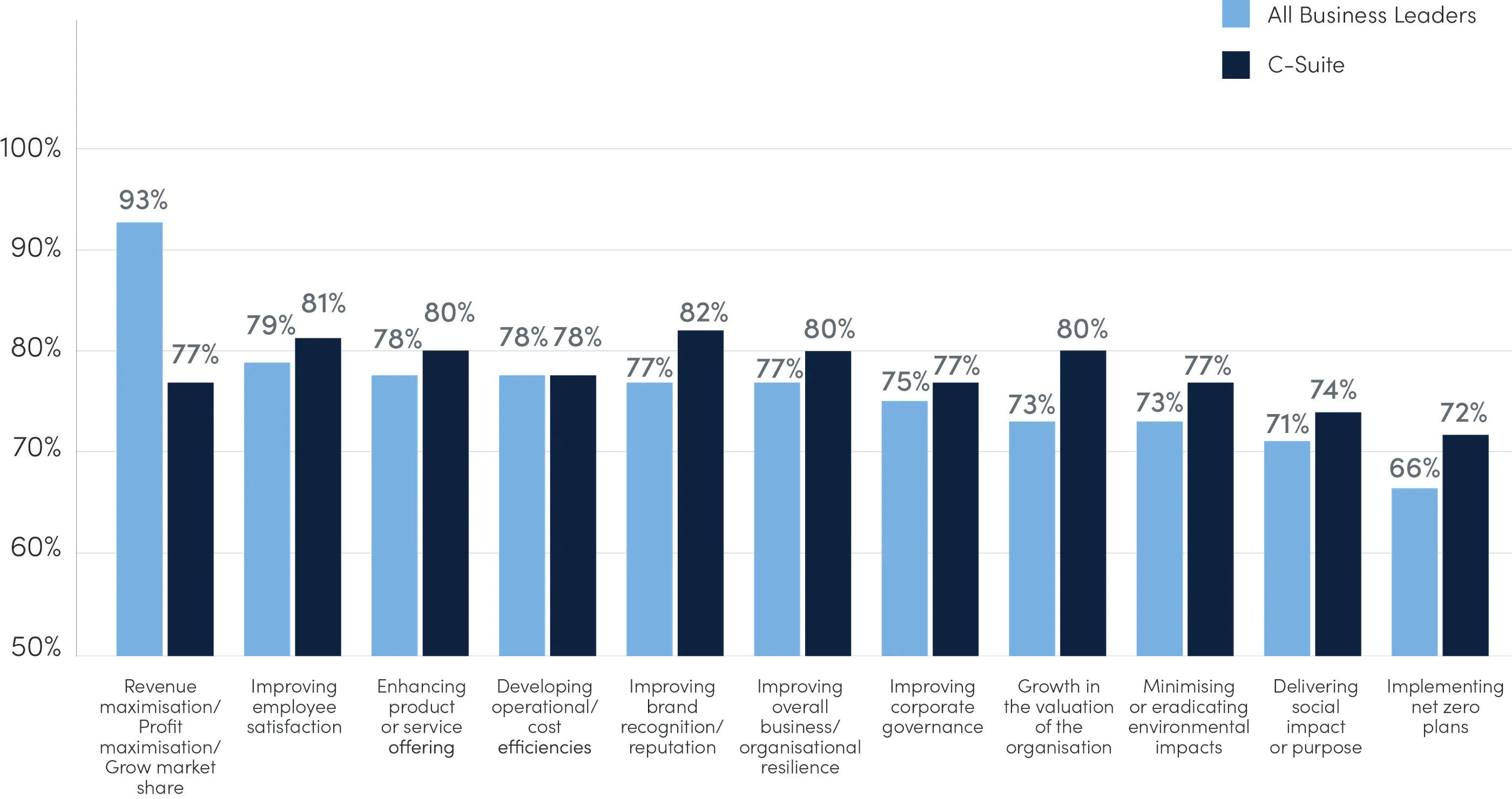 Hard-nosed business objectives are undoubtedly the greatest focus among Business Leaders; however, a sizeable majority are paying attention to ESG priorities
