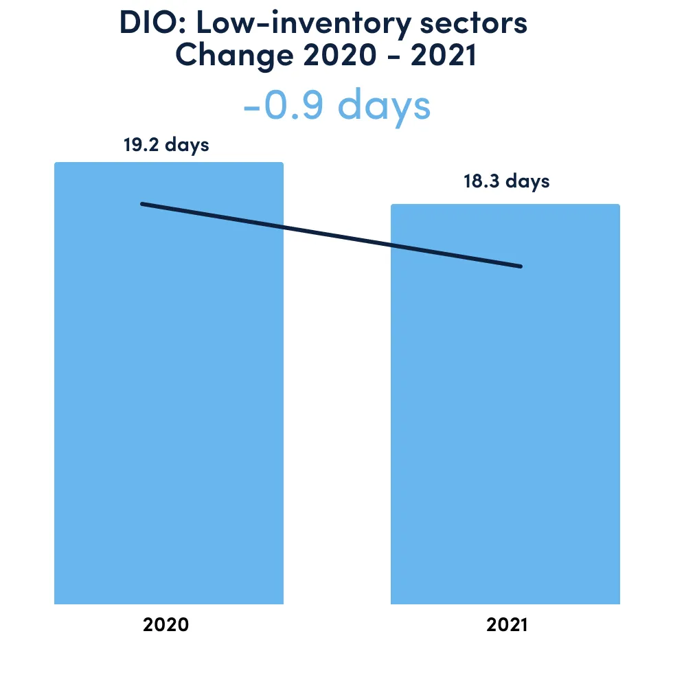 Although overall stock levels have come down in 2021, the decrease in days (0.6) was the smallest of all working capital components and it did not offset the 3-day increase in 2020. Several reasons are behind this performance: on the one hand, the slowdown in business did keep stocks levels high in the previous year, which in some sectors has not picked up fast enough to recover previous levels; on the other hand, supply chain disruptions prevalent during 2021 have led many businesses to increase their safety stocks in order to minimize the risk of stockouts, with the negative impact of lost revenue. The latter reason is prevalent in those sectors with high dependence on semiconductors and, more generally, materials, components and subassemblies supplied through global chains (see Figure 1 for the different pattern of behavior between low and high-inventory sectors). Supply chain problems are still a major concern in 2022, and there is no visible end to this situation, especially with the compounded impact of the war in Ukraine and the sanctions imposed to Russia.