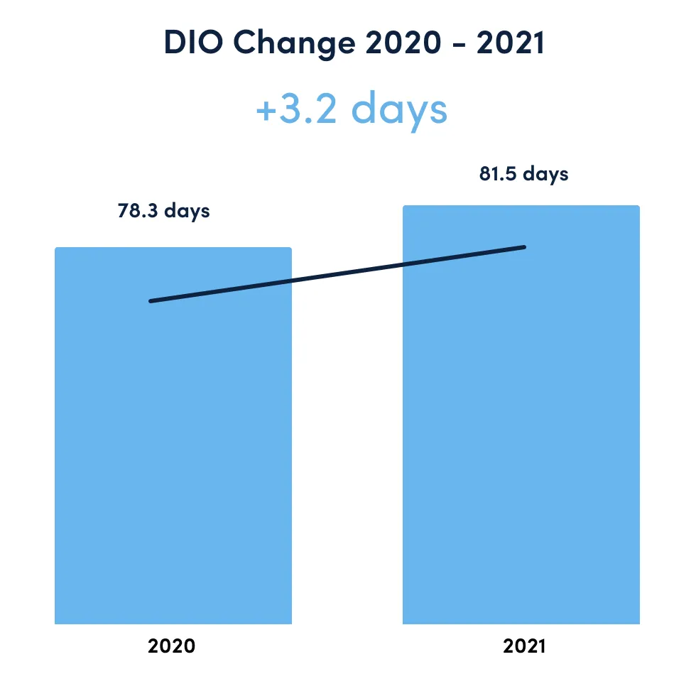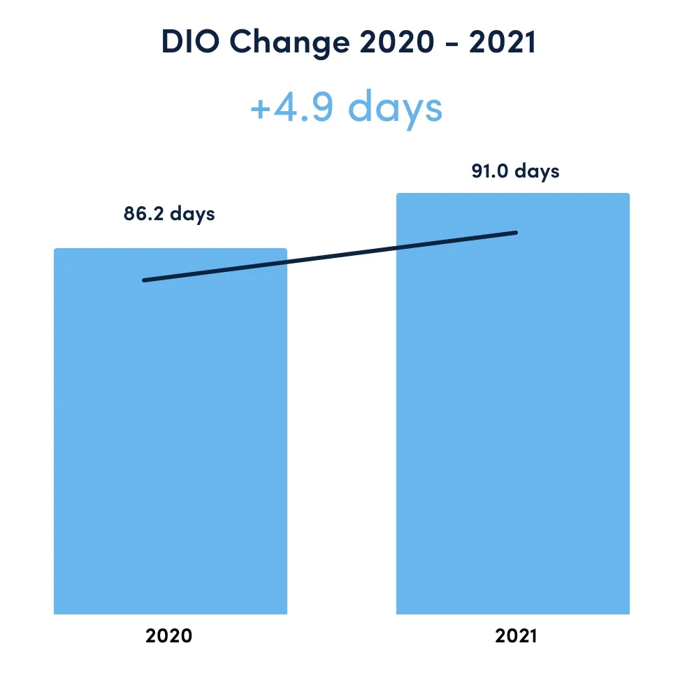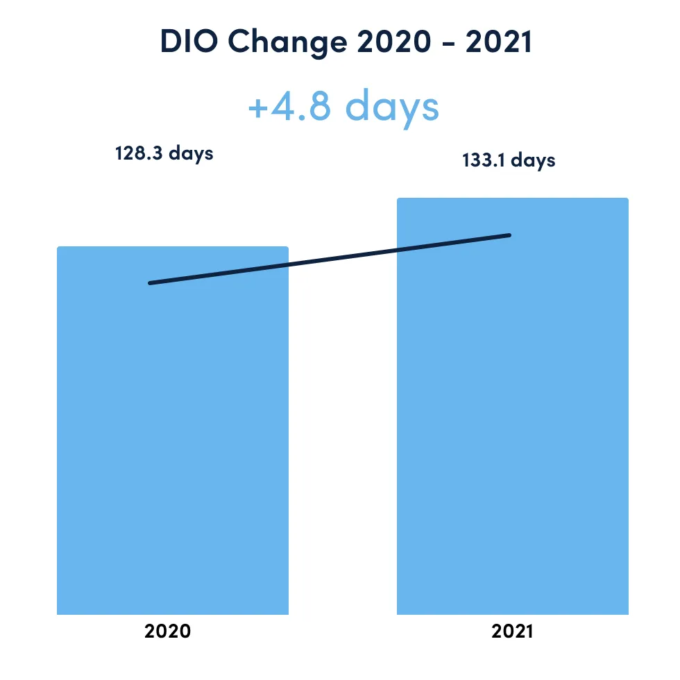 Indeed, this working capital component is the blot in the landscape of operating cash flow management as it keeps deteriorating, while the other elements improve, and this is due to a number of reasons. While the decrease in revenue during 2020 led to inventory increases following the reduced demand, in 2021 this sector is suffering as well from tensions in the global supply chain: companies are piling up stocks to meet the bounce back in demand, in a scenario of widespread shortages. The result is a 5-day DIO increase in 2021, which builds upon another 5-day increase the previous year.