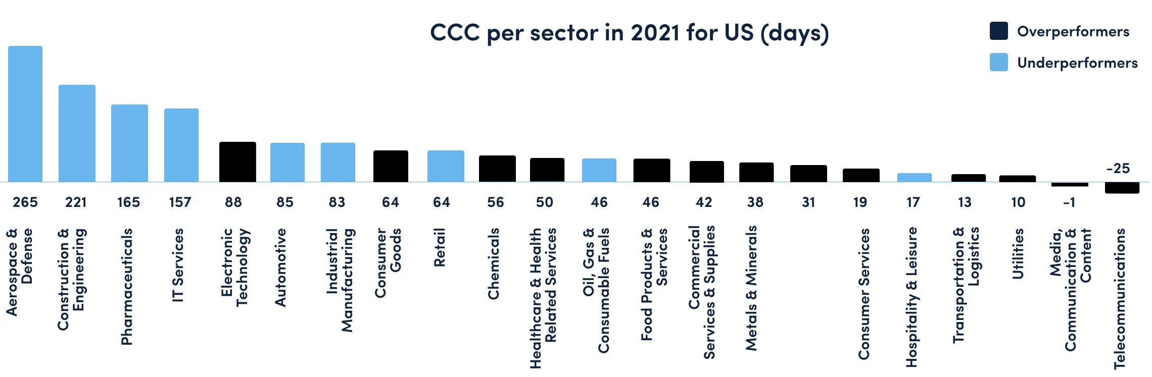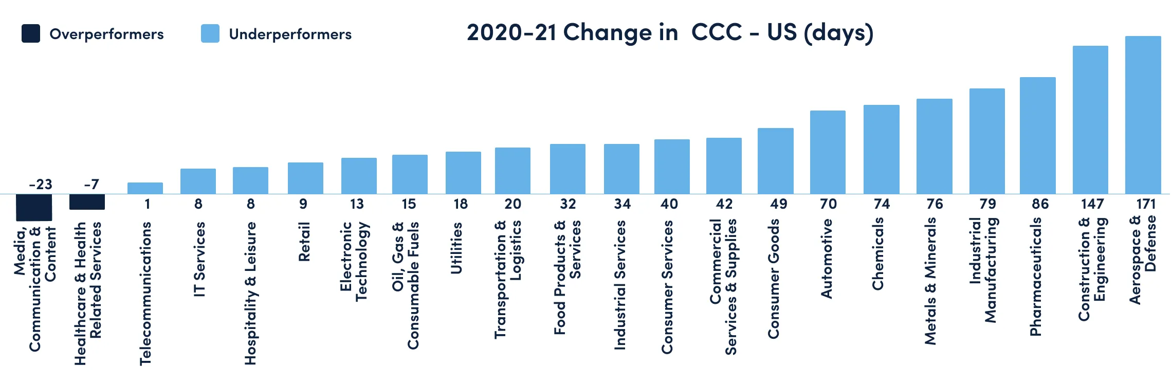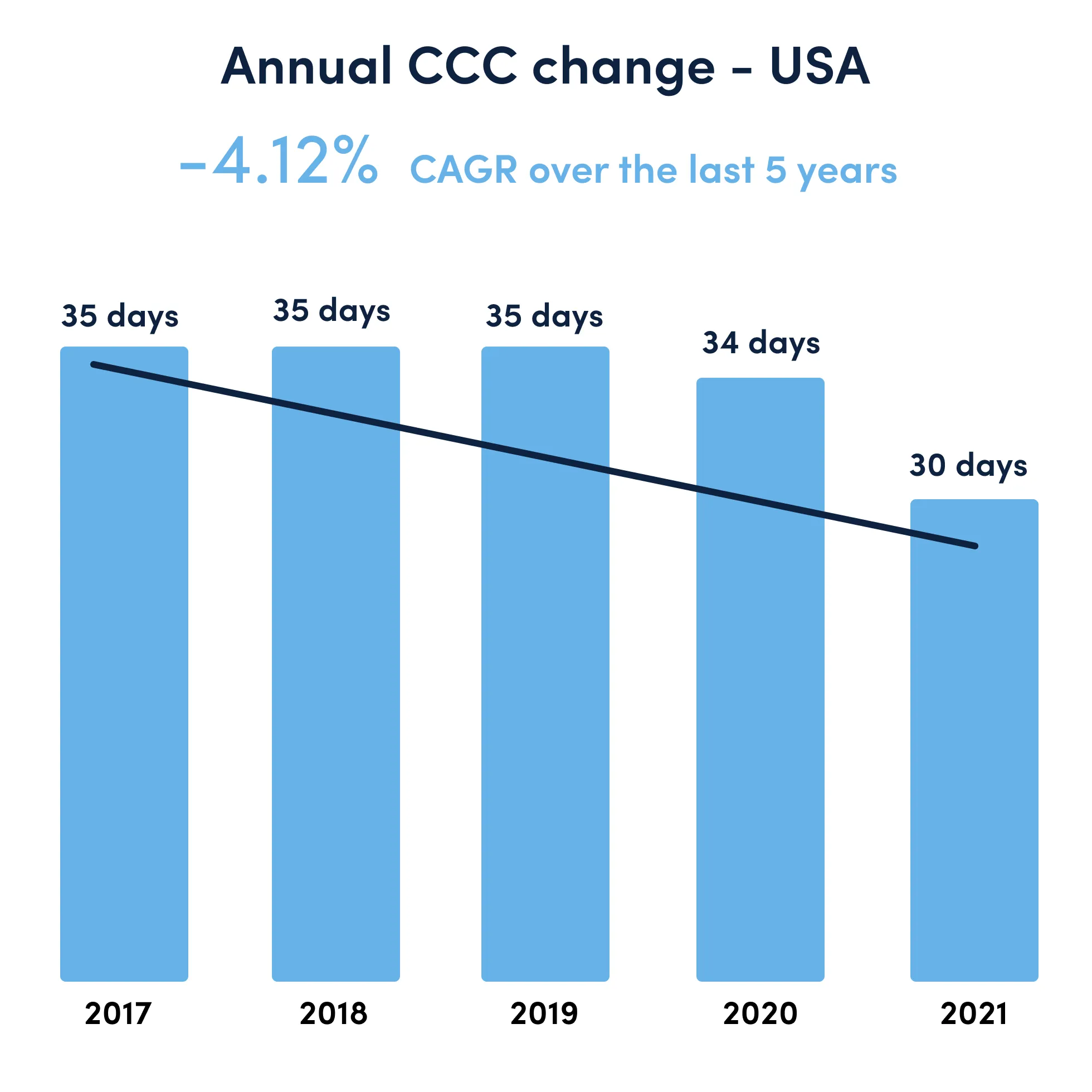 The recent years have seen strong working capital performance in the United States. The overall cash conversion cycle (CCC) indicator improved by 4 days in 2021 compared to 2020, for instance, with positive gains across all working capital components that build on a sustained five-year trend.
