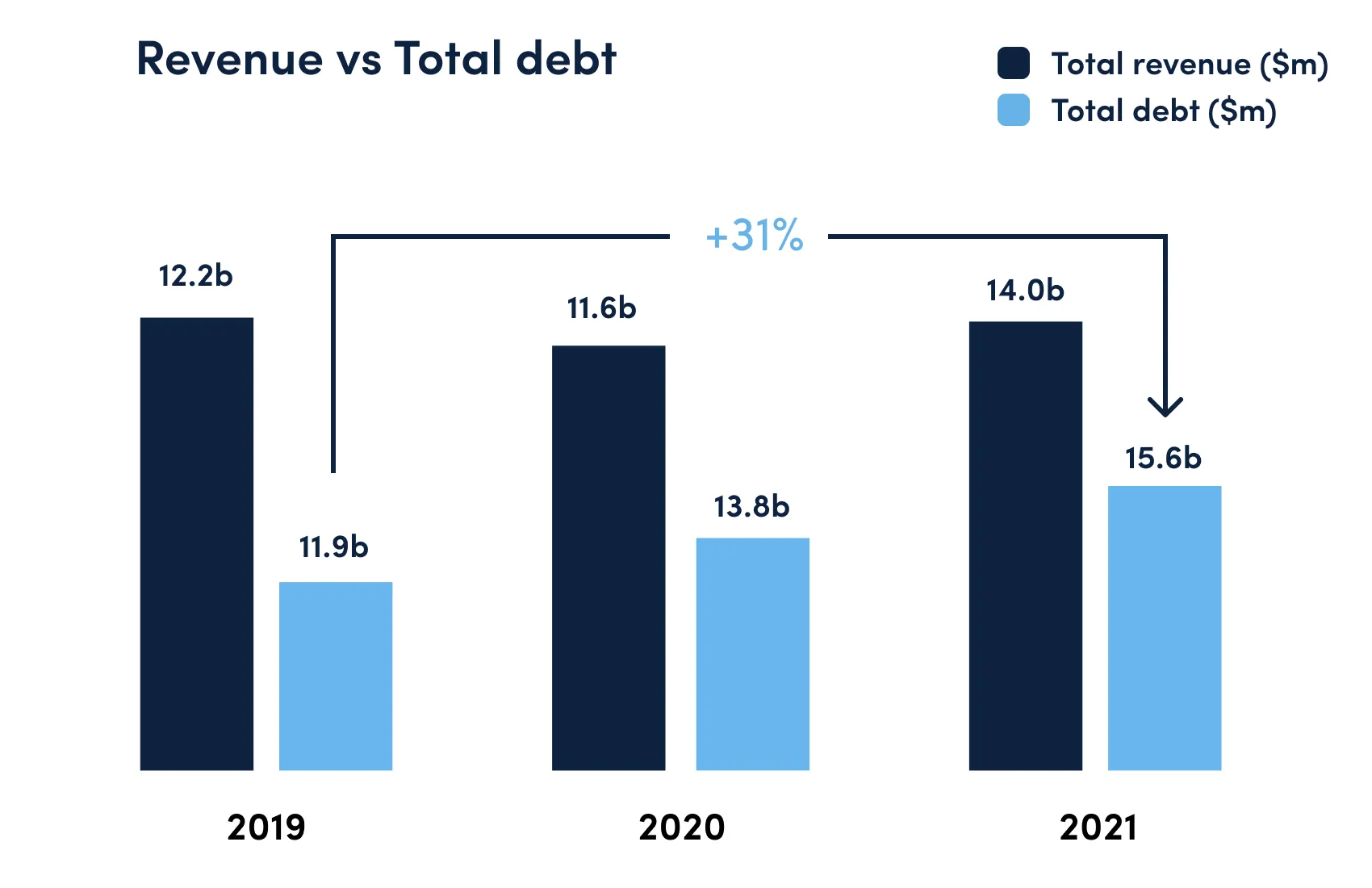 Since 2019, there has been a considerable increase in the combined short- and long-term debt of the analysed companies (+31%). Meanwhile, revenues increased by 15% (after a decrease in 2020) compared to 2019, as shown in Figure 4