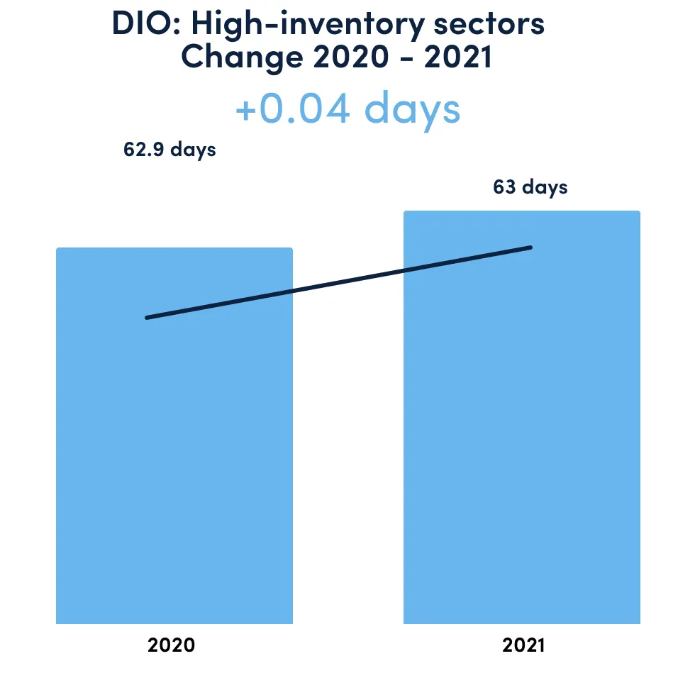 Consumer goods experienced a 1-day cash conversion cycle increase from 2020 to 2021, which put a halt to an improvement trend for the previous four years, especially in 2020, when it achieved a 4-day reduction. This deterioration is due to a serious increase of inventory levels, as we will see.