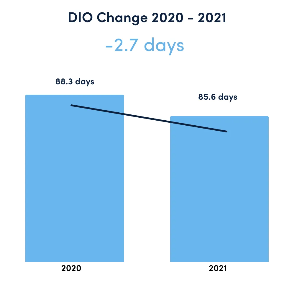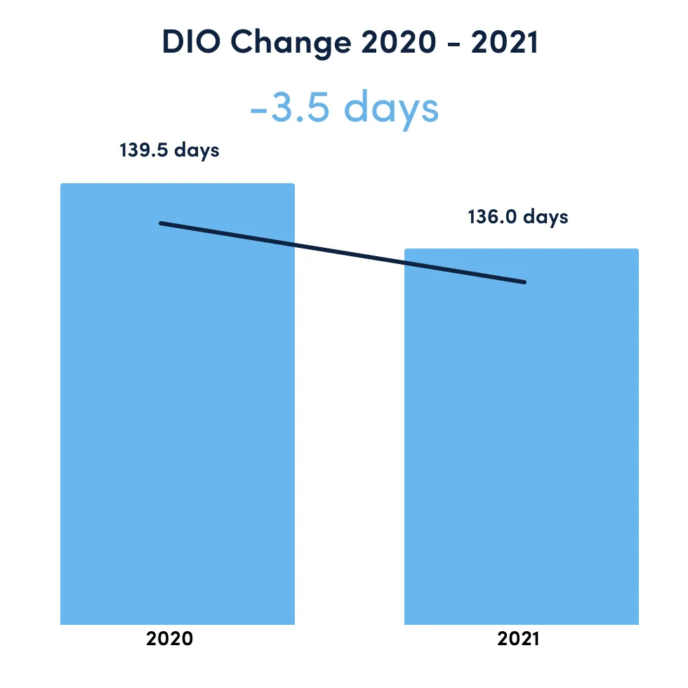DPO in 2021 improved as well, by 3 days, building on the impressive 7-day hike in 2020 and sustaining an uninterrupted 5-year trend. This indicates companies have been able to relay onto their suppliers part of the pressure derived from their increased inventories.